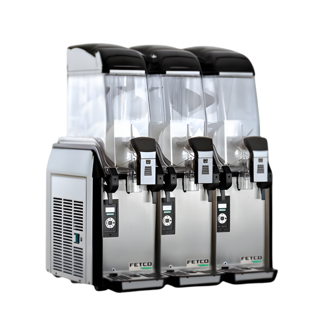 Máquina comercial de tres recipientes para preparar y dispensar bebidas congeladas con alta capacidad y versatilidad operativa. El equipo incorpora controles electrónicos avanzados que facilitan la operación y mantenimiento, permitiendo programar funciones como ciclos automáticos de descongelado, bloqueo de teclado, alertas de nivel mínimo y diagnósticos del sistema. Estas funciones ayudan a mantener estabilidad operativa y permiten ajustes directos desde el panel táctil, incluso después de interrupciones eléctricas, ya que conserva su configuración programada.